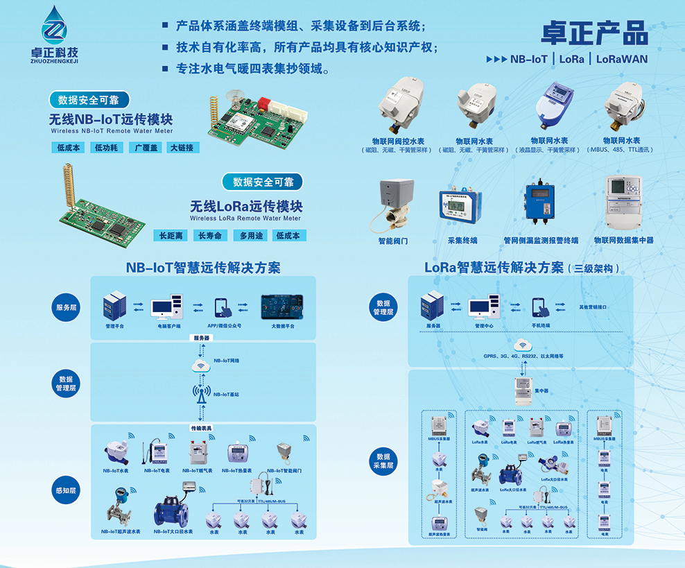 河南卓正電子科技有限公司,專業(yè)的物聯(lián)網(wǎng)表應(yīng)用方案提供商,擁有一支多名博士、碩士組成的核心研發(fā)團隊,率先將NB-IoT、LoRa遠傳技術(shù)、智能閥控技術(shù)應(yīng)用于水務(wù)、熱力、燃氣、農(nóng)業(yè)、消防、環(huán)境領(lǐng)域,以“領(lǐng)航智能儀表 構(gòu)建智慧城市”為企業(yè)使命,立志成為中國智能儀表行業(yè)領(lǐng)域中的領(lǐng)跑者,為推動中國能源計量事業(yè)的發(fā)展貢獻自己的力量!