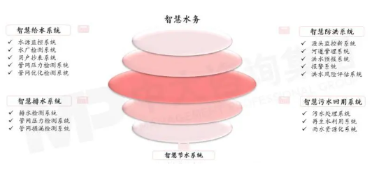 智慧水務(wù)系統(tǒng)由智慧給水、智慧排水、智慧防洪、智慧污水回用、智慧節(jié)水等五大子系統(tǒng)構(gòu)成,每個子系統(tǒng)下又包含水源監(jiān)控、水廠檢測、用戶超表等不同功能模塊。